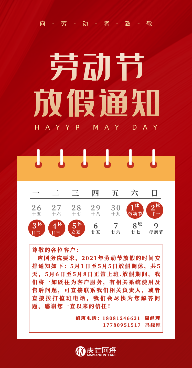 5月1日(星期六)至5月5日(星期三)放假調休,共5天,5月6日至5月8日正常上班。