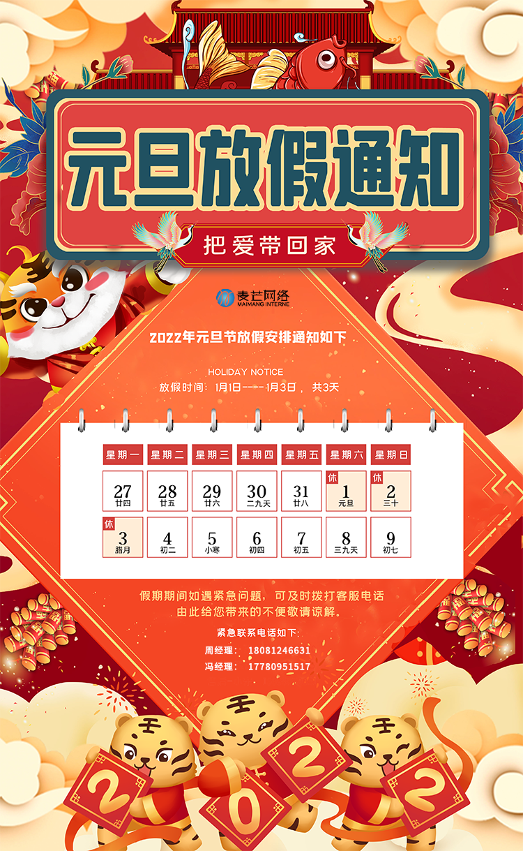 新年伊始,萬象更新。2022年元旦節即將來臨,根據國家法定假期的相關規定,并結合公司實際,現對2022年元旦節放假安排如下: